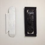 - “Diptych white and black / untitled,” 2012. (Assemblies) mixed media on skateboard white piece 42 x16 inch, black piece 40 x 18 inch