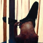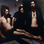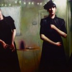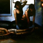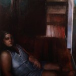 The figures in my work emerge within a living space. While at first the interiors appear distinguishable, the space breaks and folds into a mental atmosphere that invades the psyche. Each scratch on the canvas becomes a wound on the surface of the mind as well as on the distance between figures and the space in which they inhabit. The figures are an emotive access point of interaction. Their presence, handling and demeanor become anchors within the situation presented. My large-scale paintings are related to the body of the observer by encouraging navigation to obtain some form of comprehension. The individual compiles a personal sense of the image by occupying various proximities to the object, which become whole through fragmented navigation. In a sense the paintings become an event in which the viewer’s own interaction sustains the image, feeling the sting of the event without the circumstance.